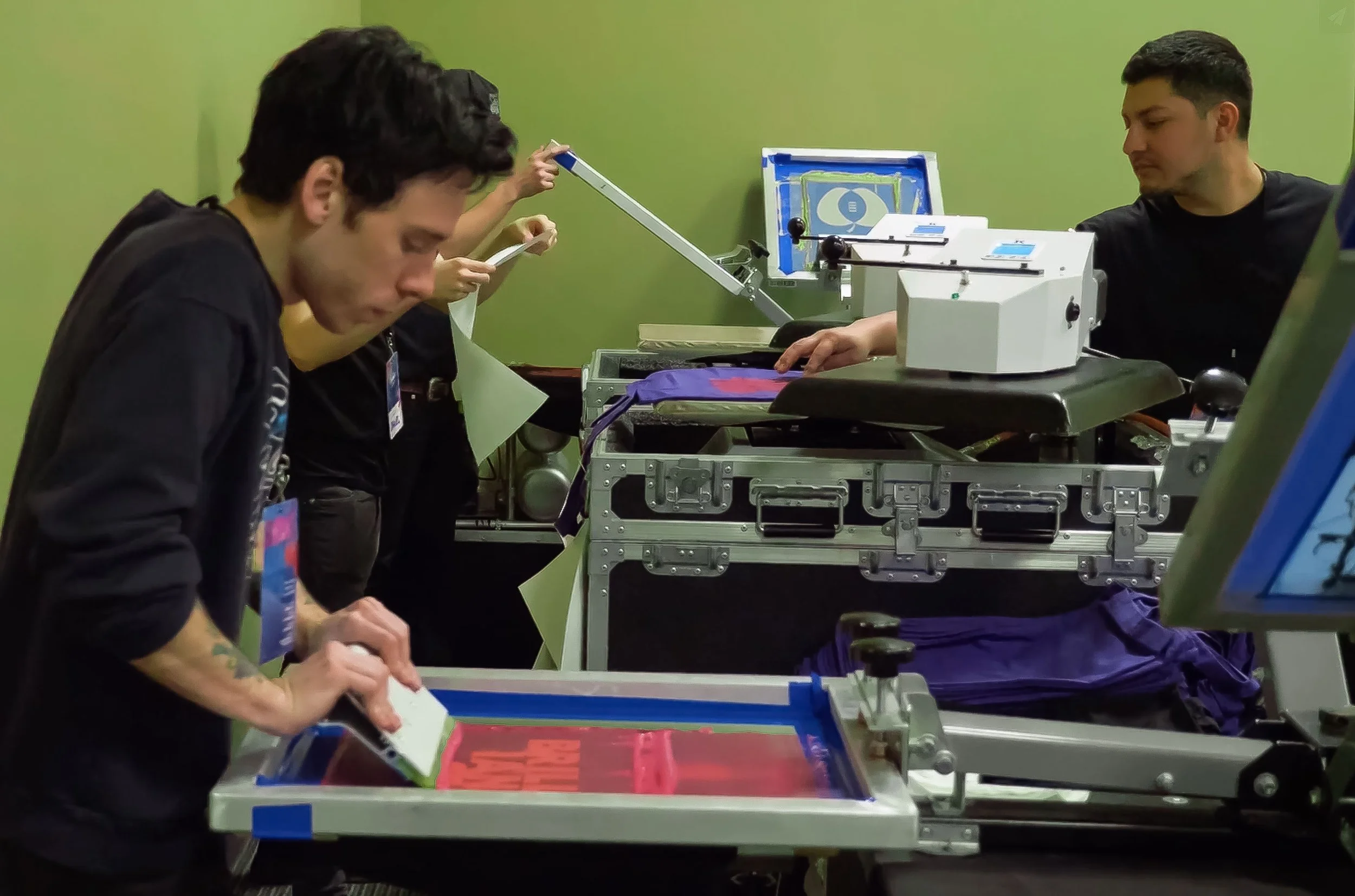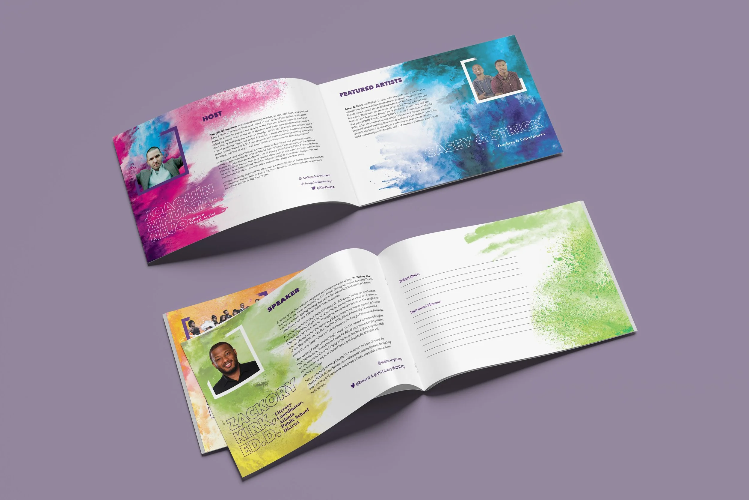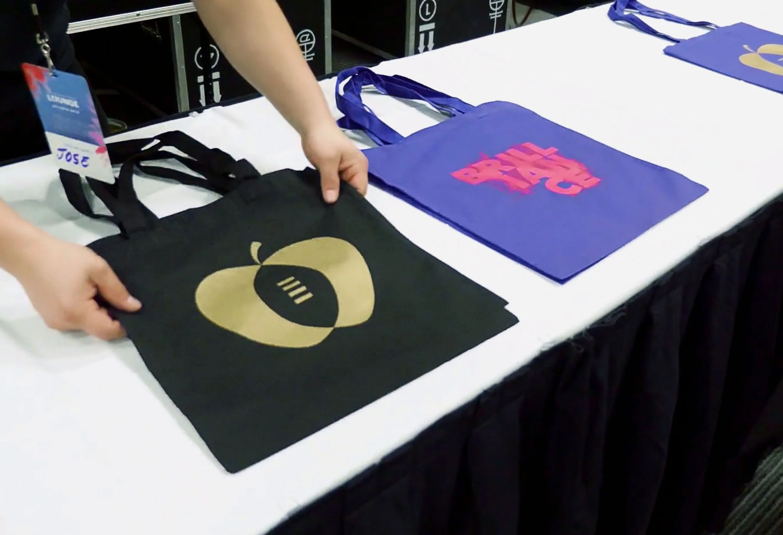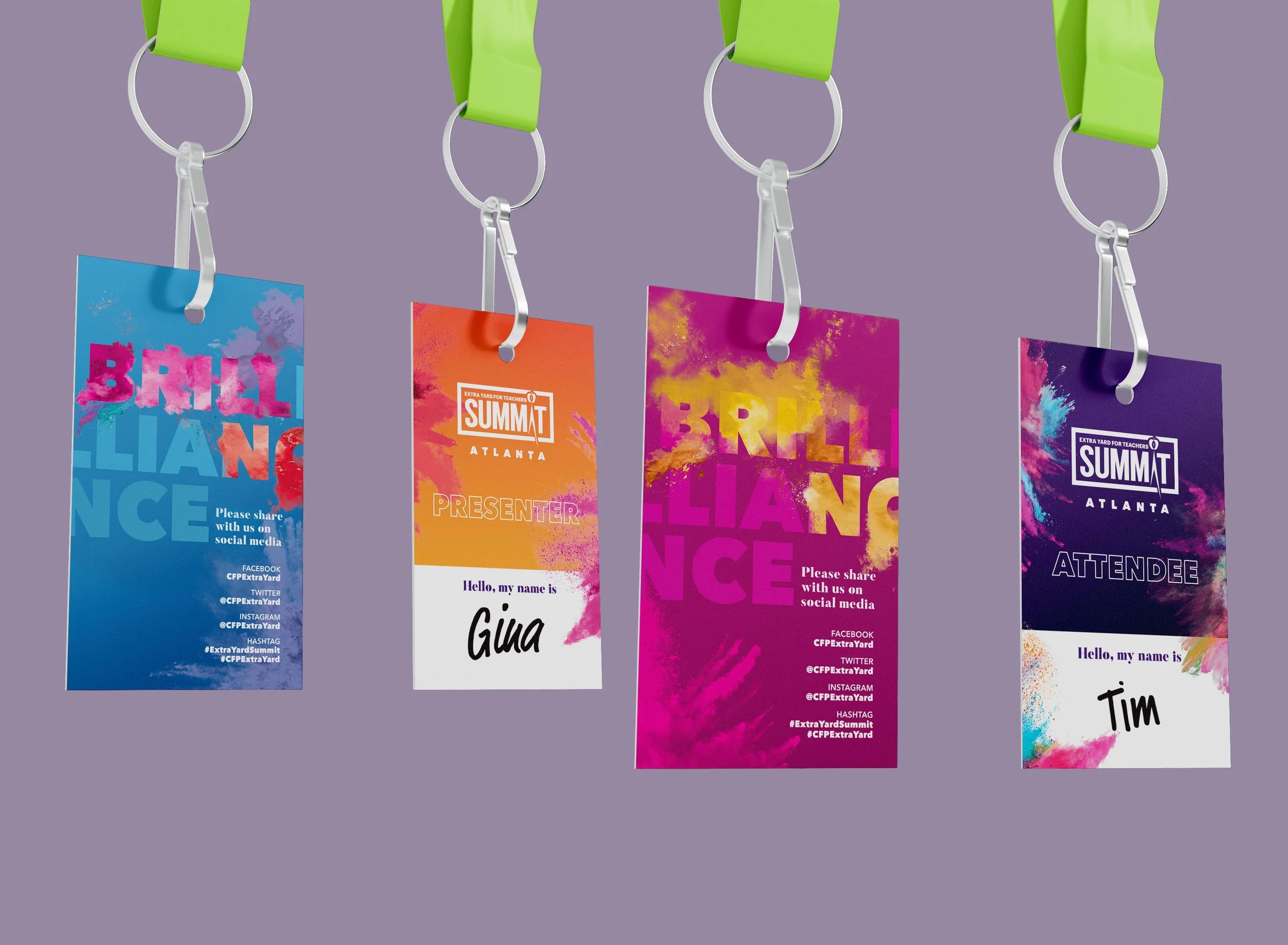 Print collateral included color-coded admission badges, an event program that encouraged active participation through note taking, and a 1-color design for live screen printing of tote bags at the event.