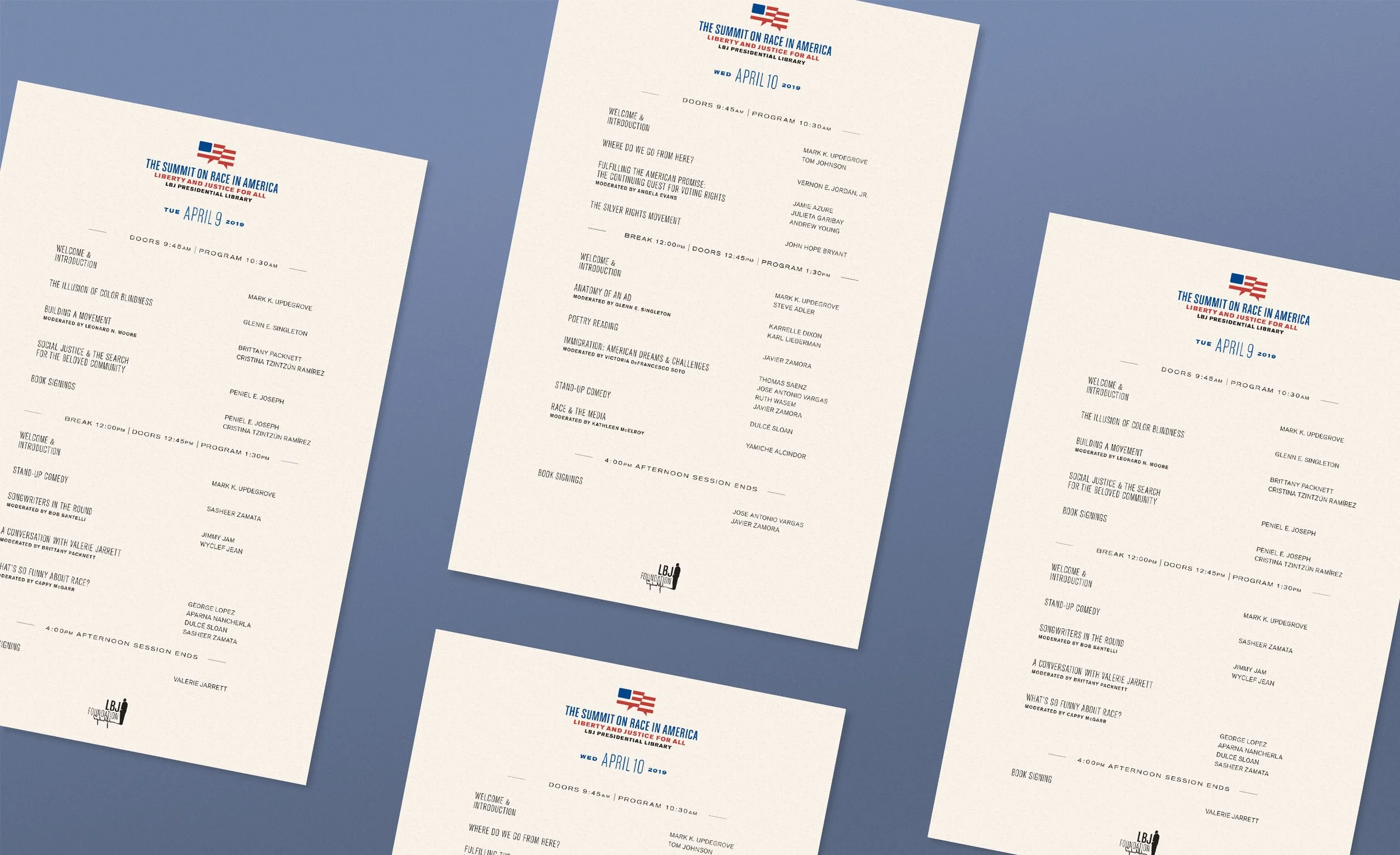 As Designer at Arrow, I had the opportunity to work on visual identity and event collateral design for The Summit on Race in America hosted by the LBJ Foundation at the LBJ Presidential Library. The event—featuring civil rights icons, activists, musicians, comedians, thought leaders, and community leaders—aimed to explore our nation’s continuing racial divide and struggle for racial equality.