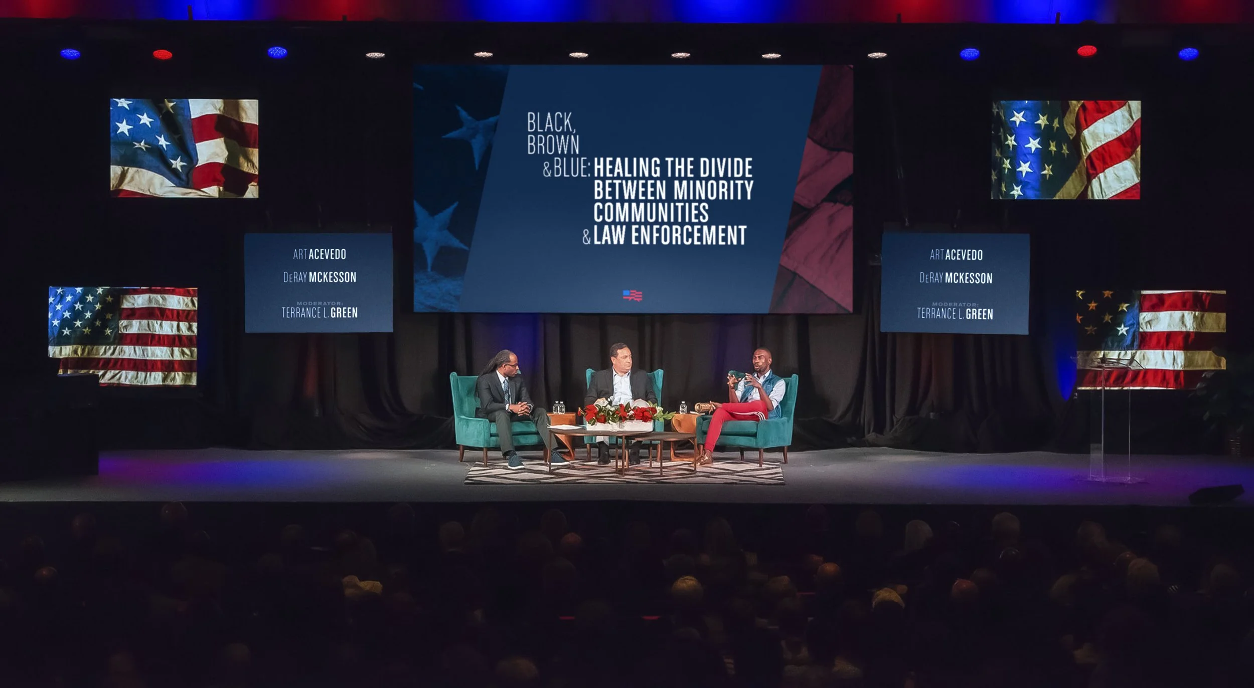 The Summit’s signature mark featured two speech bubbles within a waving American flag, offset from one another along a diagonal to represent the inherent tensions of this complex issue. I designed hero artwork that followed this concept using type, color, motion, and the American flag to illustrate it as both a division and a convergence. This visual identity was applied to print collateral and stage visuals.