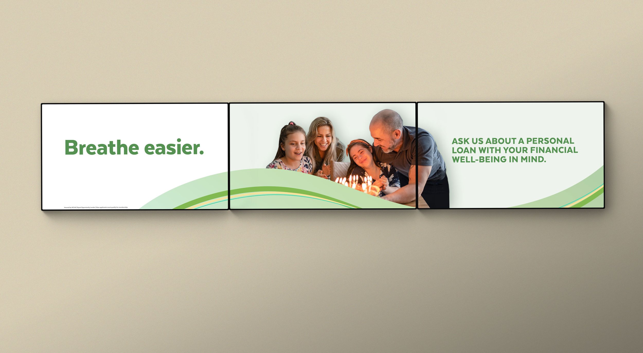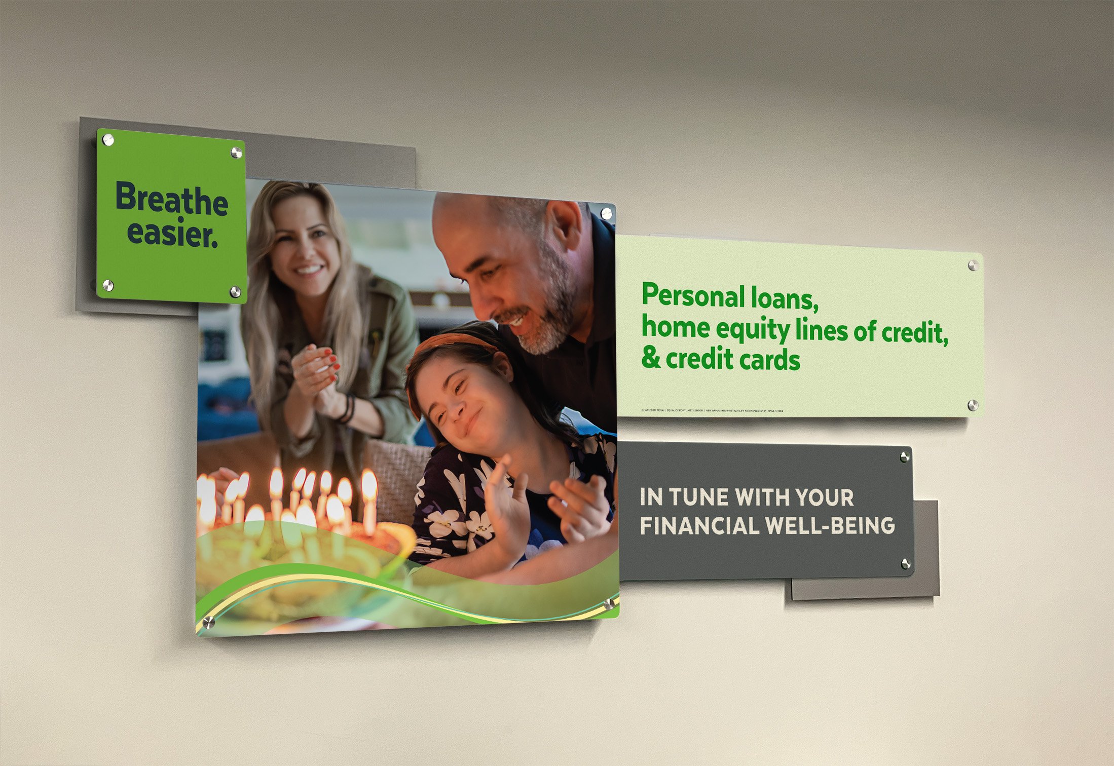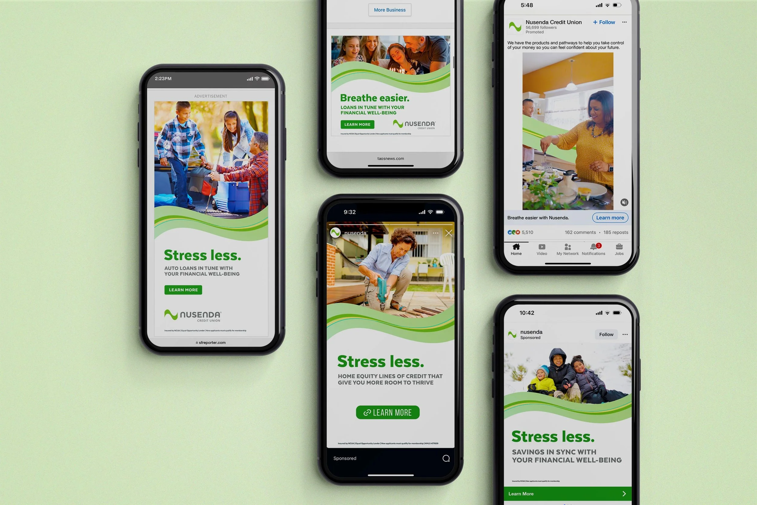 Working off of the existing wave-shaped mark in Nusenda’s logo, I created layered wave form assets to use in photo and video treatments. The colorful, undulating lines of differing widths add movement and interest to collateral, and illustrate the credit union’s involvement in the community.
