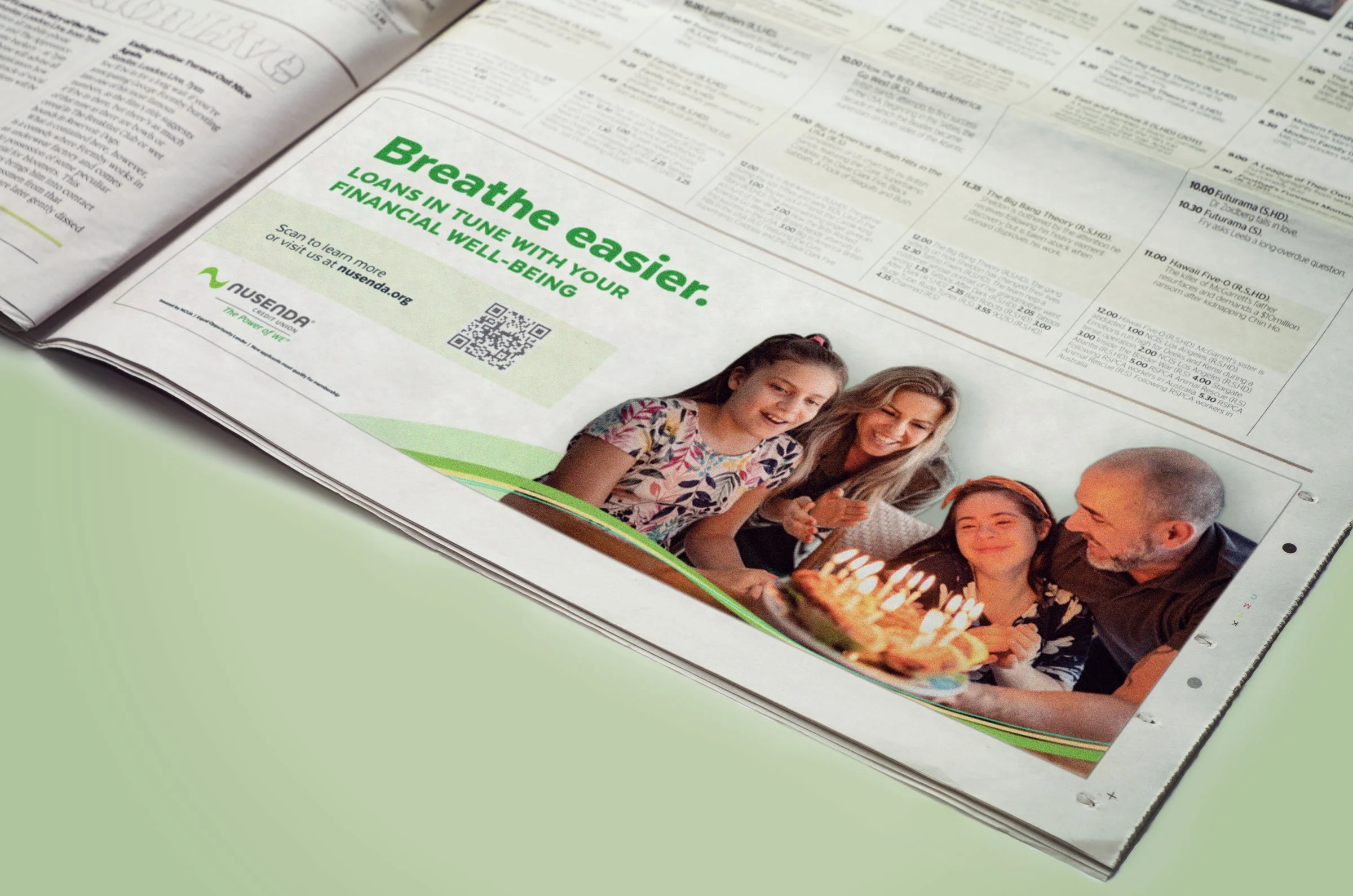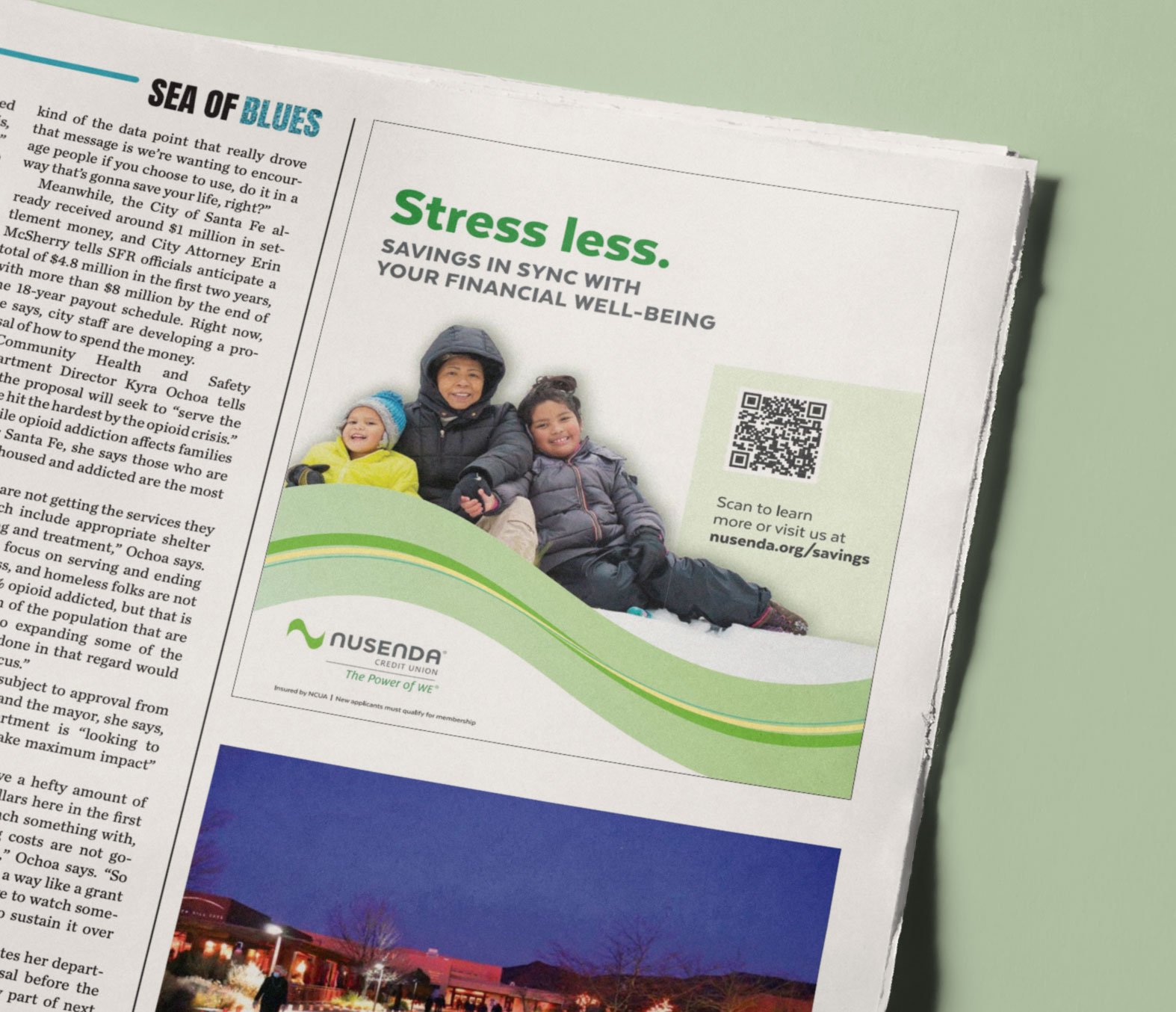 As Designer at Arrow, I led a design refresh of Nusenda Credit Union’s visual identity, and I later designed subsequent ad campaigns. A long-standing brand in New Mexico, Nusenda was in need of more dynamic visuals, a color palette with improved accessibility, and standardized methods to apply them. I gave them new, improved ways to visually express themselves, their products and services, and the work they do in their communities. I also delivered clear and detailed brand guidelines that outline how to produce new collateral across print and digital media.