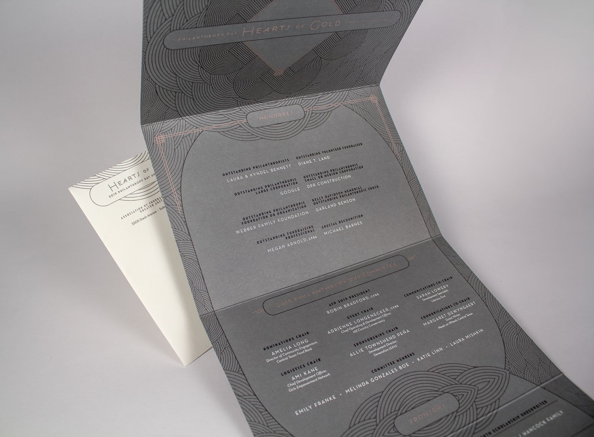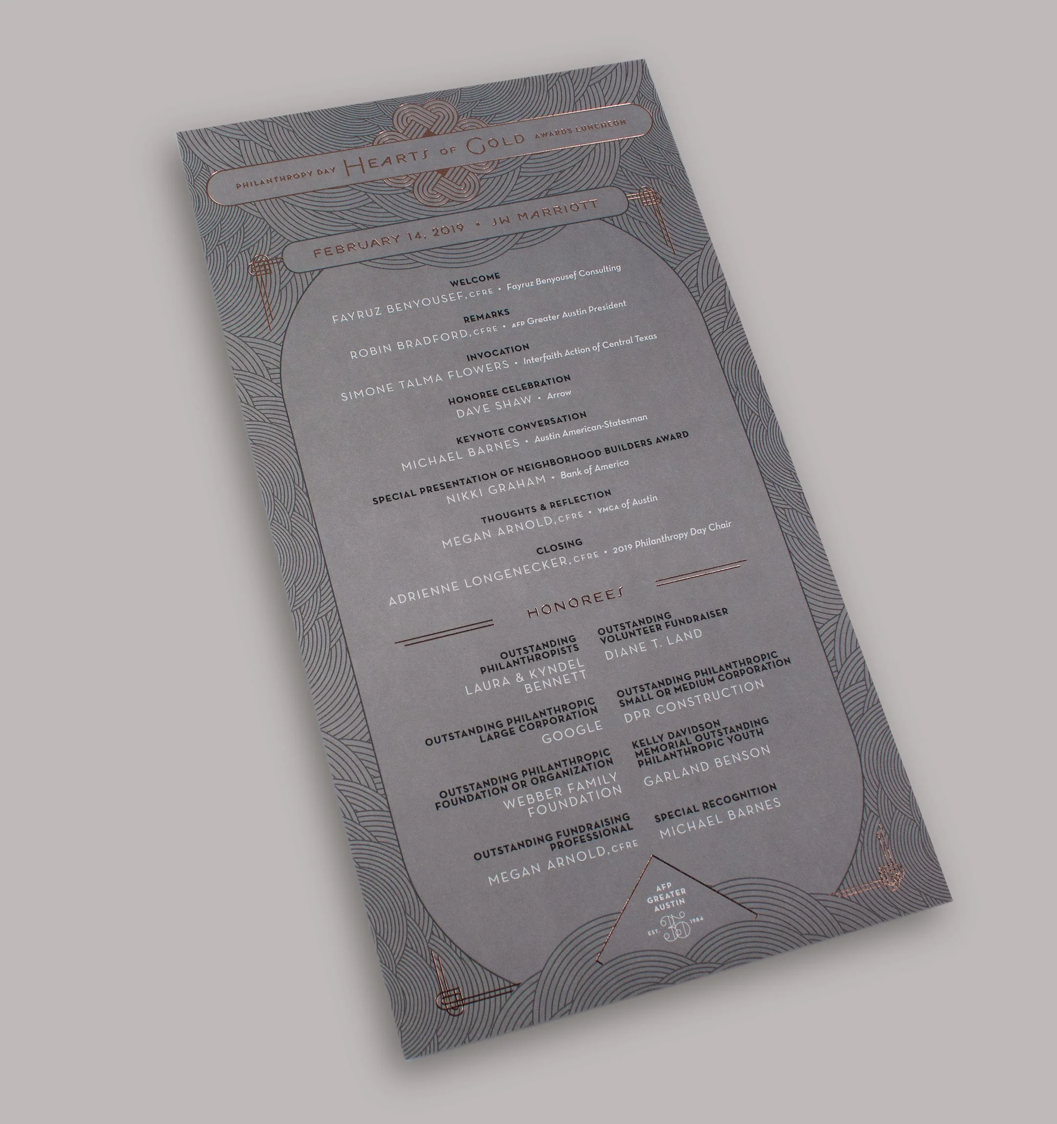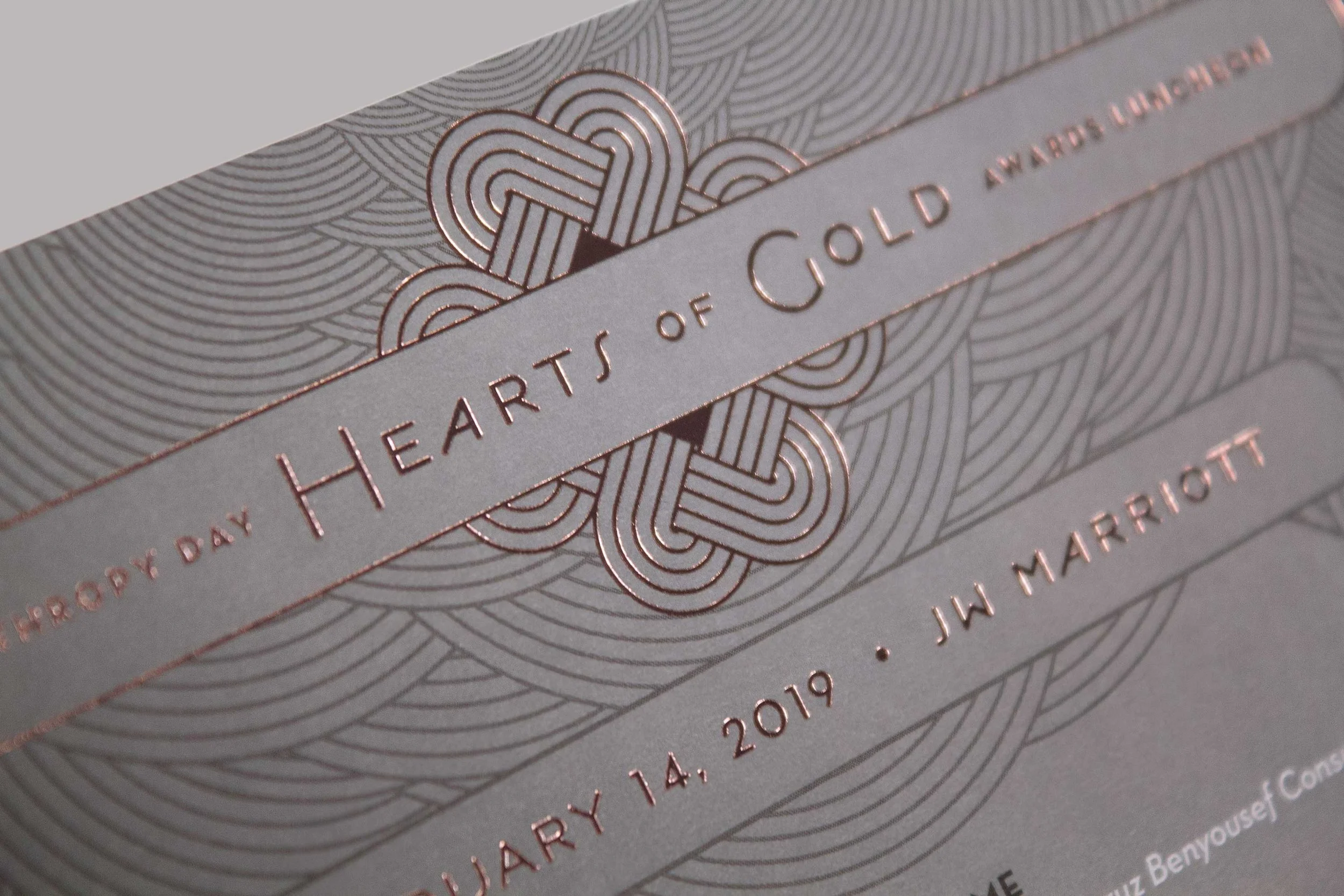 The event happened to fall on Valentine’s Day. I came up with the name Hearts of Gold, which not only plays off the holiday, but also commends the true spirit of service that the event honorees exhibit each day of their lives. The event name lockups and all print & digital collateral utilize subtle, elegant patterns composed of interlocking hearts.
