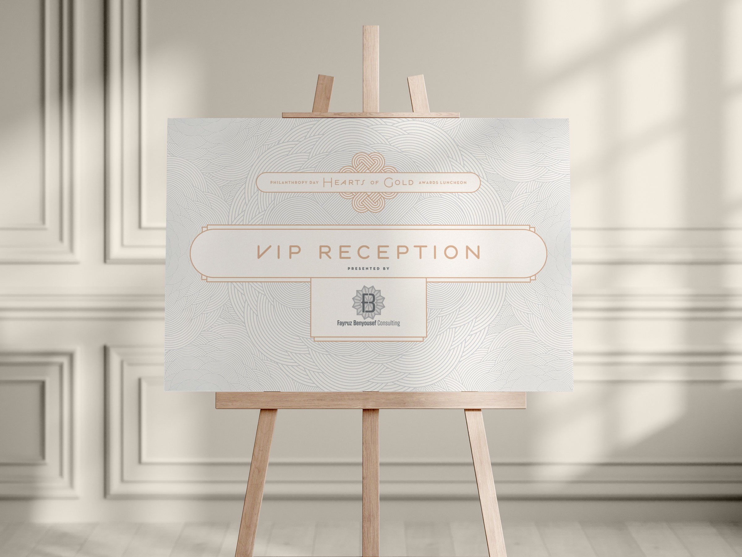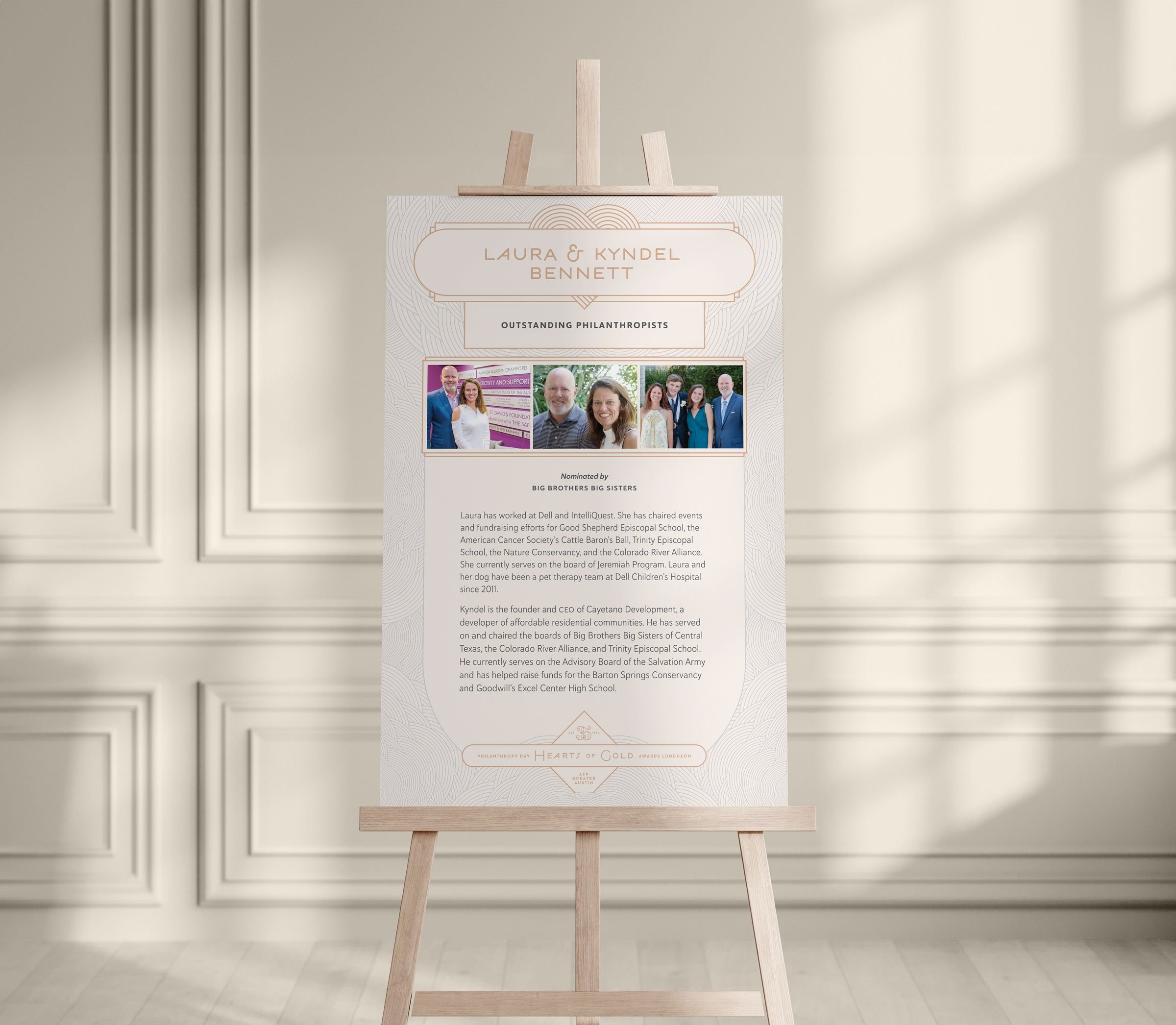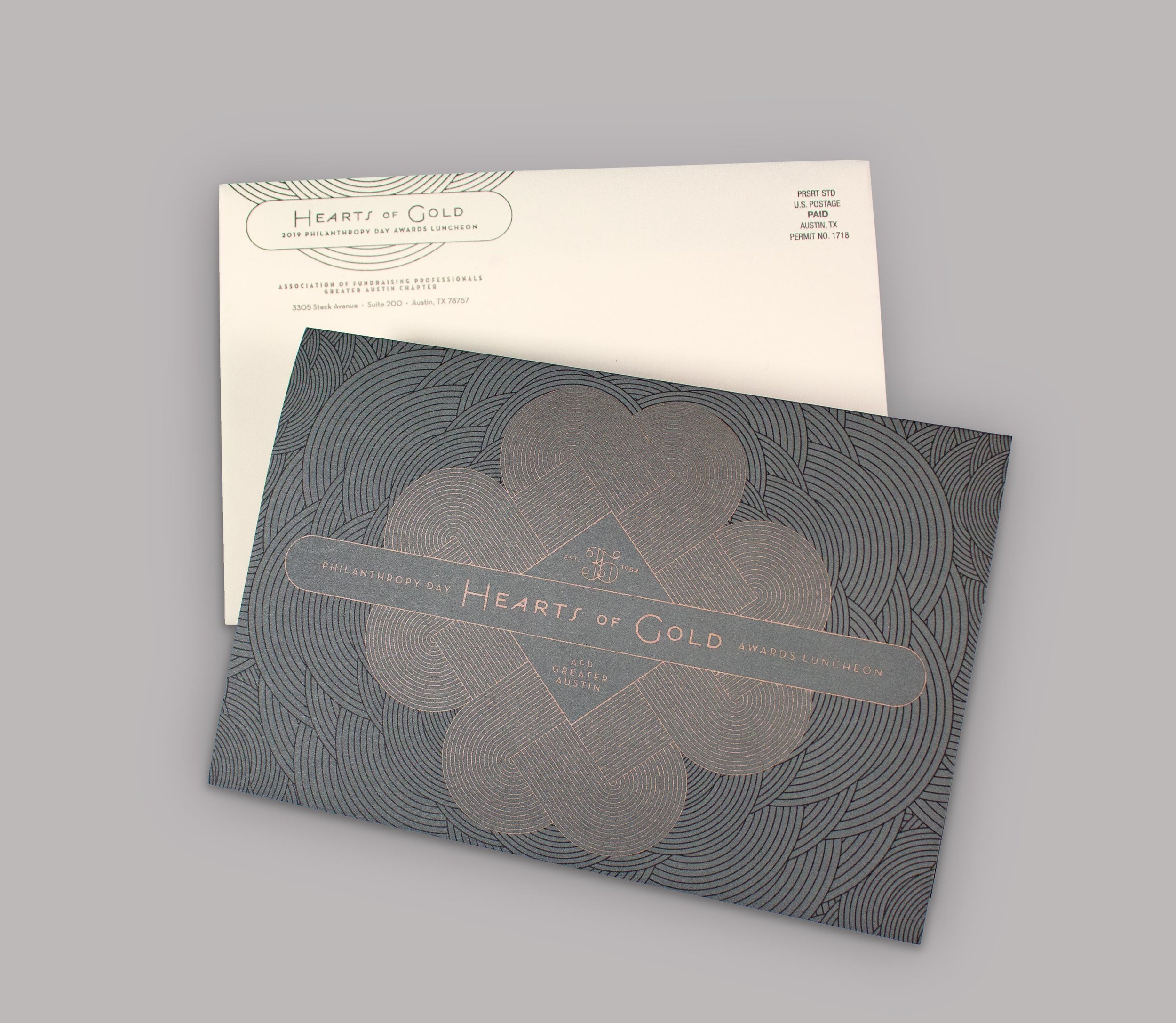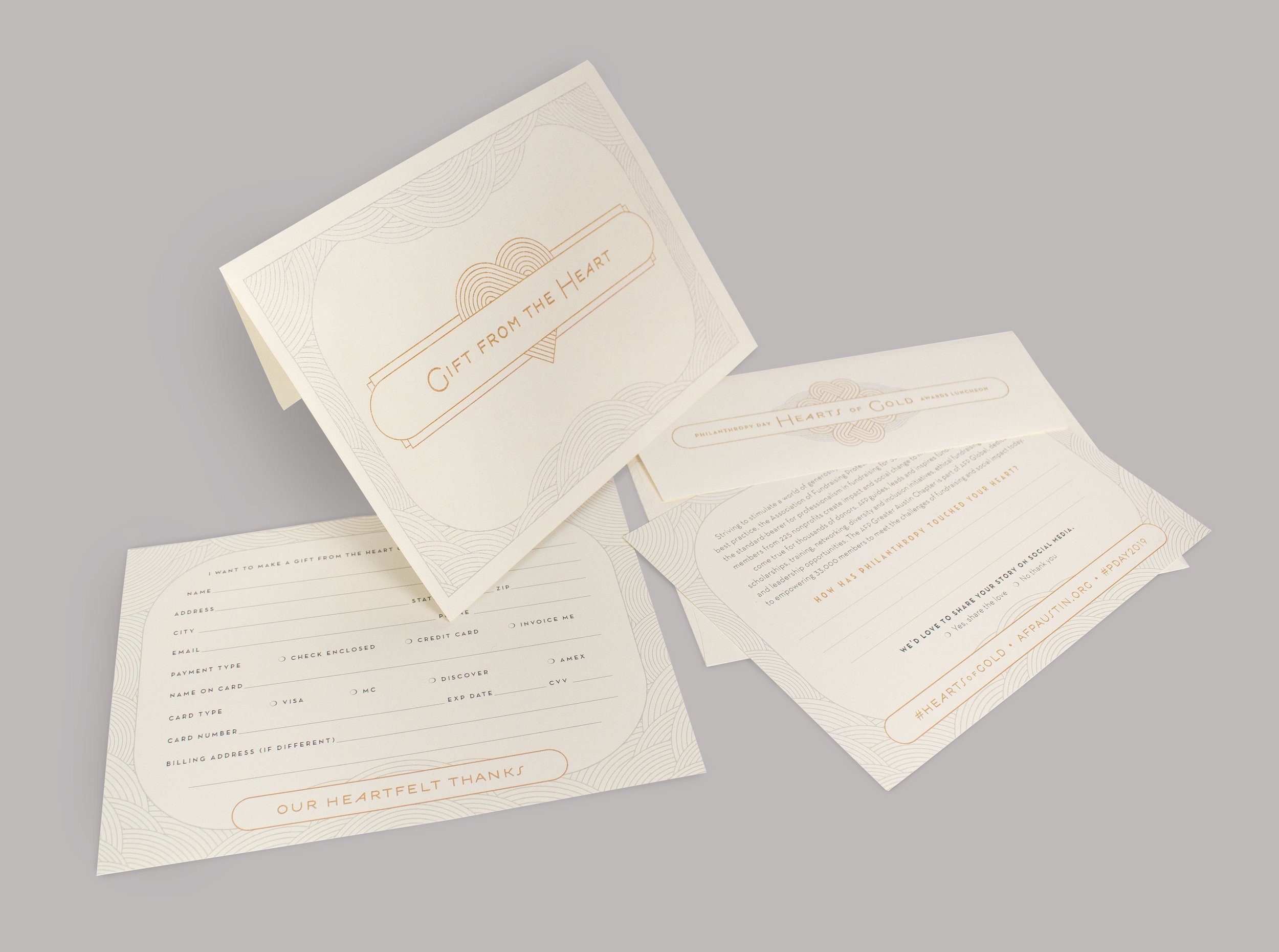 The event happened to fall on Valentine’s Day. I came up with the name Hearts of Gold, which not only plays off the holiday, but also commends the true spirit of service that the event honorees exhibit each day of their lives. The event name lockups and all print & digital collateral utilize subtle, elegant patterns composed of interlocking hearts.