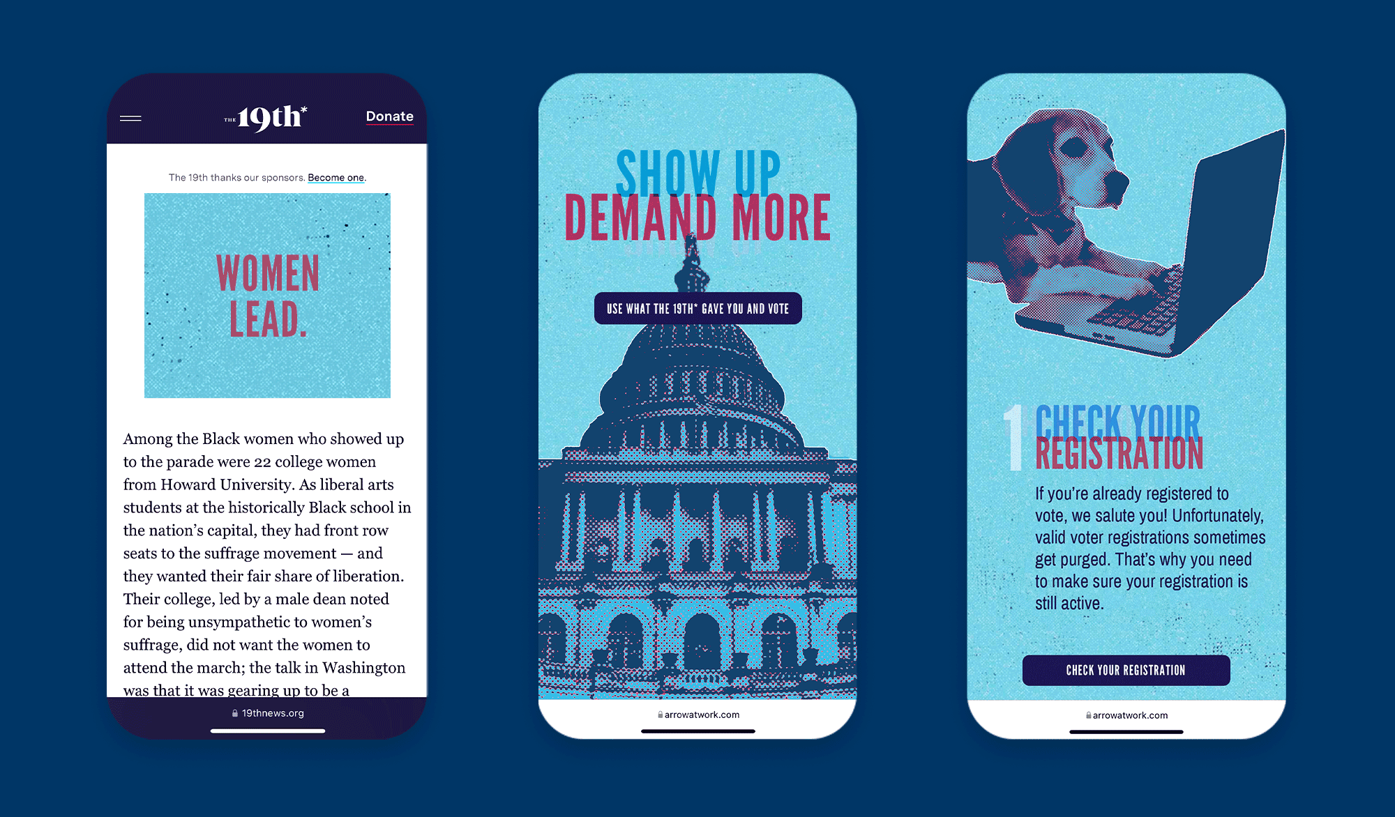 When Arrow client The 19th News officially launched their website in 2020, they offered the agency some digital display ad space as a thank-you. Self-promotion is not Arrow’s style though, so I designed a way to use the space to further The 19th’s mission—and that of the suffragists who started it all.